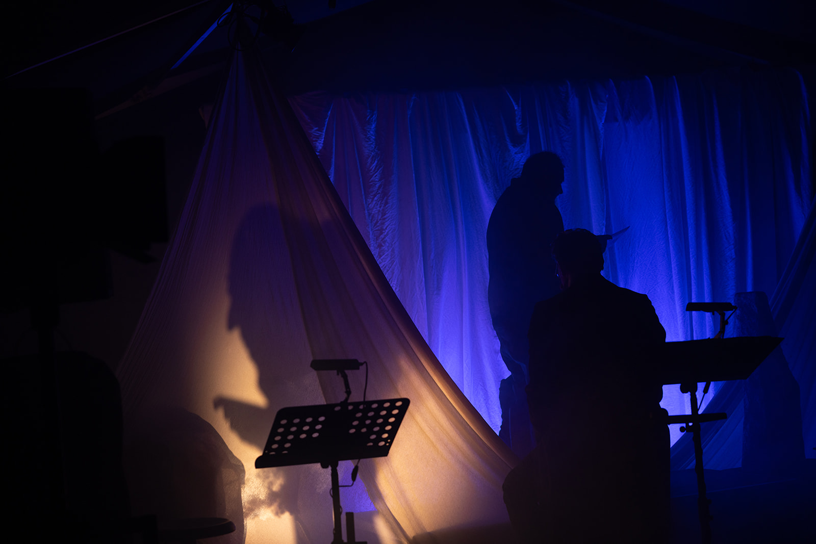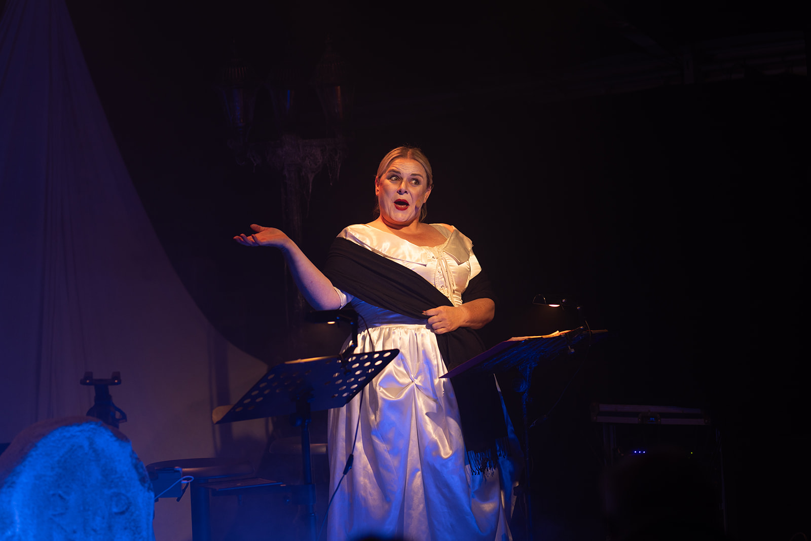 Ein echter Grusel-Schocker und außerdem der erste Vampir–Roman. 1897 veröffentlichte der irische Schriftsteller Bram Stoker seinen Roman, der in der Folge eine ungeahnte Erfolgsgeschichte erlebte. Der Marburger Musiker Stefan Kissel hat für jede Figur im Stück ein eigenes musikalisches Thema geschrieben und atmosphärische Musik komponiert, die den Rhythmus des Abends wesentlich mitbestimmen. In aufwendiger Kleinarbeit hat Ben Streibig einen beeindruckenden Sound produziert und auf mehrere Boxen um das Publikum herum verteilt. Der Zuschauer bekommt so den Eindruck, direkt im Geschehen zu sitzen: Fledermäuse fliegen über die Köpfe, Wind bläst durch das Publikum, Stimmen, wie aus weiter Ferne, sind zu hören. Gänsehaut! Ein Friedhof (extra angefertigt!), Laternen und Schatten sorgen für Grusel-Stimmung. Viel Nebel und die Beleuchtung sorgen für die entsprechende Horror-Atmosphäre.